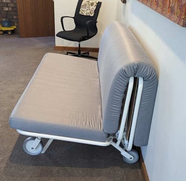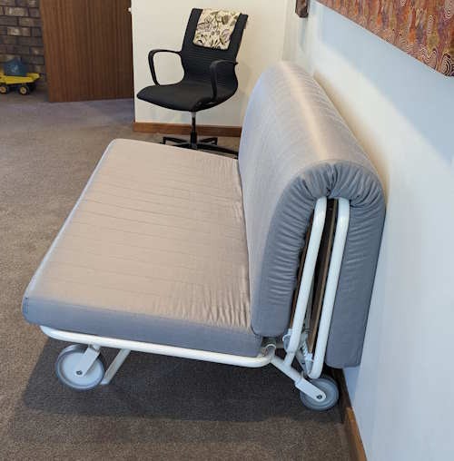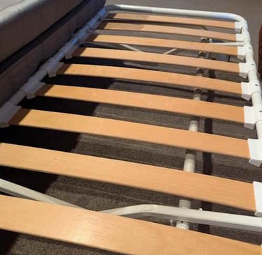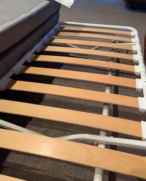 Ikea fold up futon queen size bed with sprung slatted base - firm futon. Matress comes in two parts zip together for easier transport.